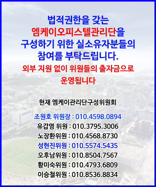 MK오피스텔비상대책위원회는 MK오피스텔관리단을 구성하기 위해 최선의 노력을 다하고 있습니다. 구분소유자분들의 적극적인 참여를 부탁드립니다.
